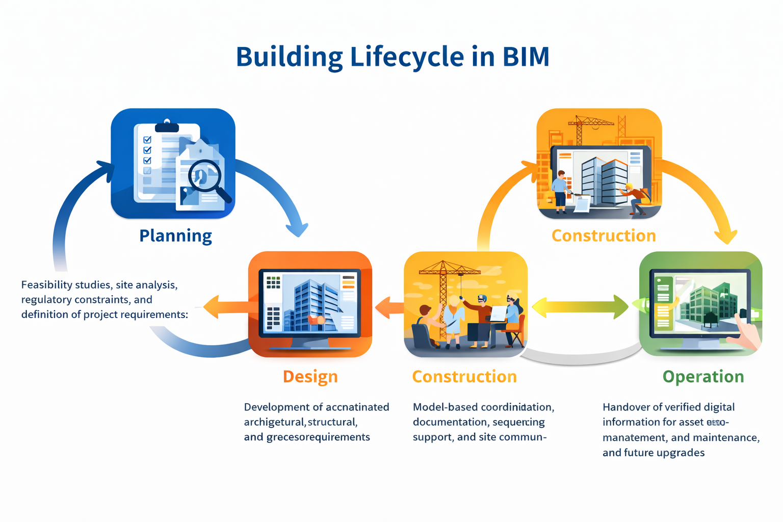 To clearly understand what is Building lifecycle in BIM, it is important to move beyond the idea of BIM as only a design tool. In a lifecycle context, BIM represents a continuous information process that supports decision-making throughout a building’s entire existence, rather than a sequence of disconnected deliverables.
