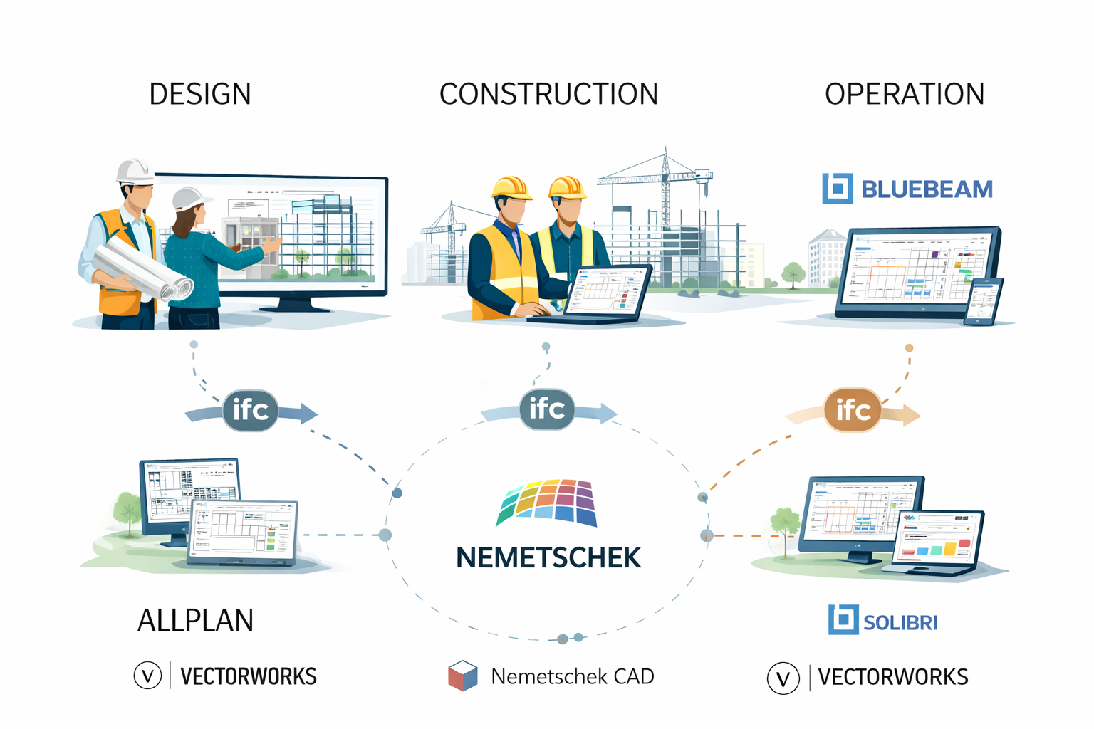 Nemetschek Software supports the full building lifecycle, from early planning through operation and maintenance. Each phase is addressed by tools designed for specific responsibilities rather than generic use.